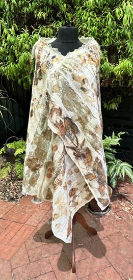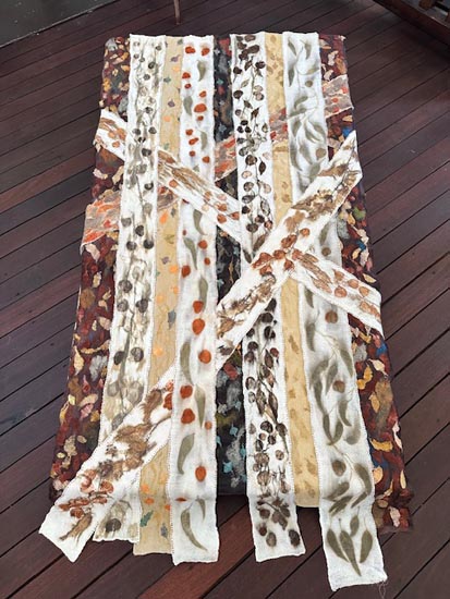 Merino felted wool the foundation of capturing native plant material through iron soaked printing. The process is meditative from the layering of wool, arrangement of leaves and a collaborative wrapping process. The results only revealed after slow steaming and cooling overnight.