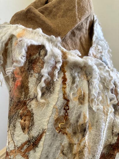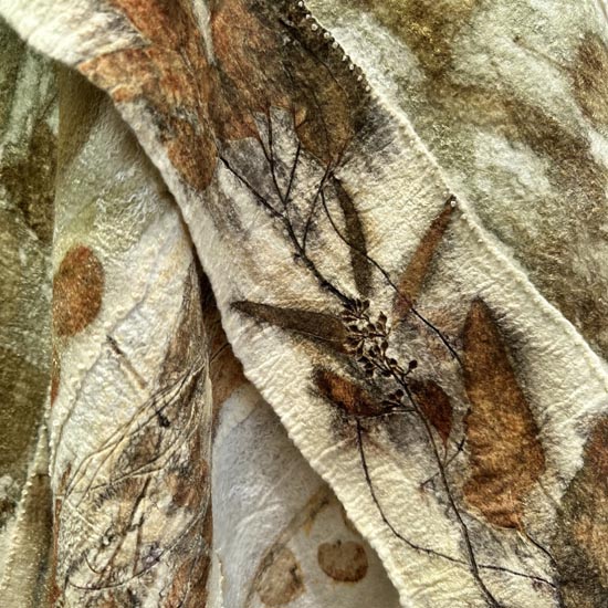 Merino felted wool the foundation of capturing native plant material through iron soaked printing. The process is meditative from the layering of wool, arrangement of leaves and a collaborative wrapping process. The results only revealed after slow steaming and cooling overnight.